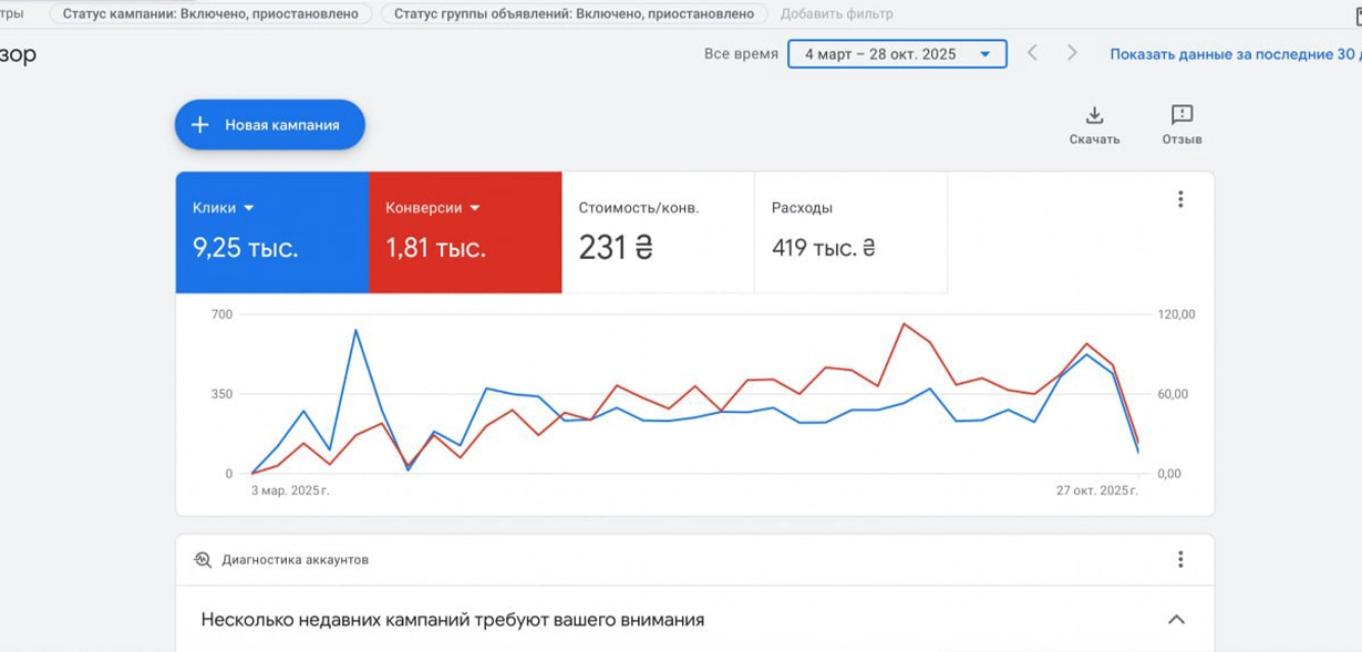 Работаем с Вадимом по рекламе клининга. До этого просто сливали бюджет — заявки были дорогие и много левых. После переработки сайта и гугла стало больше целевых заявок по низкой цене. Сейчас реклама работает стабильно, стоимость заявки нас устраивает. Всё по делу, без лишних обещаний.